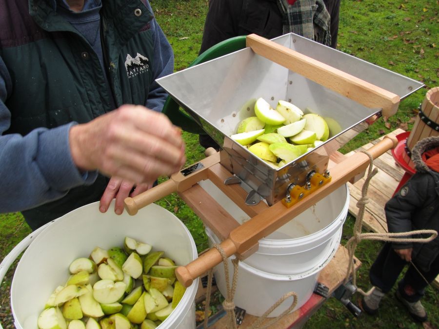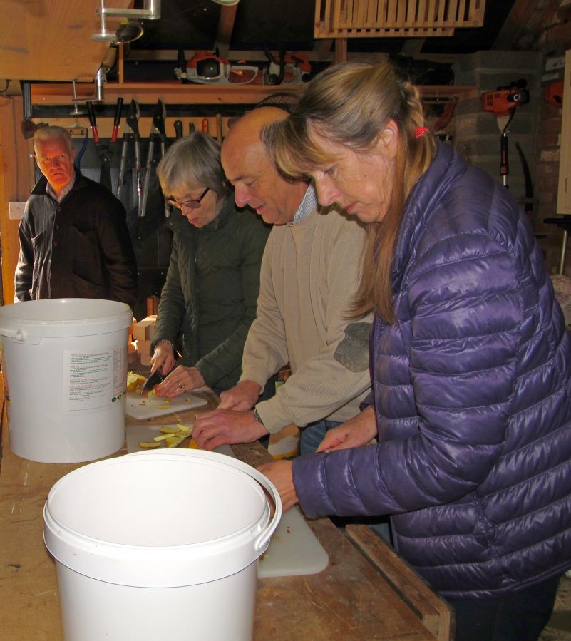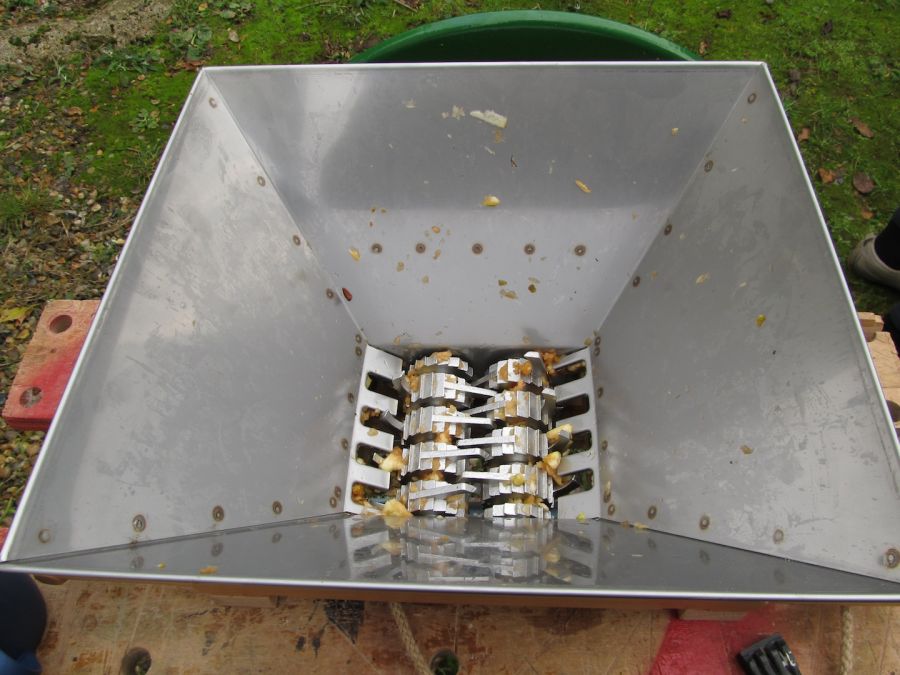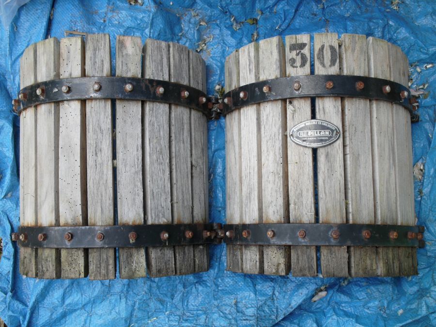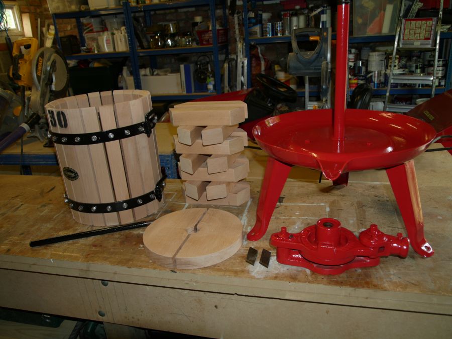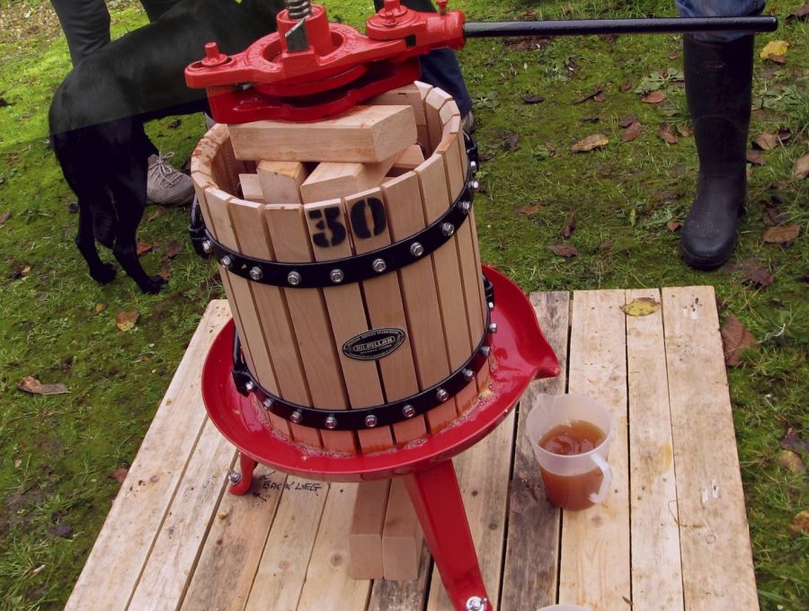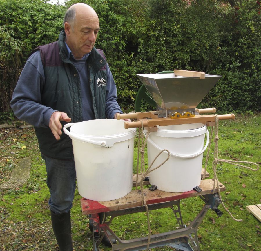 First hay from the meadow - September 2010 and we take the first hay crop from the meadow around the treesHay trailer - September 2010 and the first crop of hay is loaded,covered against the wet and ready to goFirst hazelnuts - Kent Cob at L5 on 9 August 20122013 Queen Cox - The young trees are starting to bear fruit - for example the Queen Cox at B12013 Lord Lambourne - A good crop on the Lord Lambourne at M1Lord Lambourne II Ellison's Orange - 2013 Ellison's Orange at P1Norfolk Beefing - Some of the magnificent crop of Norfolk Beefing 2014 Here we go gathering nuts in ... - …October 2015. Kent Cob nuts from the tree at L5Under pressure - The orchard offers its first crop of Kent Cob nuts from L5 (also some Hazelnuts from L6)H3 H5 F2 ... - ... decoded means that 2019 brought some nice greengages, Victoria plums and mirabelles. Just missing J1, J6 and maybe Z5.Moorpark apricot and tart - The most prolific tree in our first year was the Moorpark apricot - enough to eat and to cook withApricot tarts - Tempting Moorpark apricot tarts baked by Christine, the village tree warden2014 quince produce - The first substantial crop of Meecher's Prolific quinces meant that Mary was able to make some St James Village Orchard preservesQuince Butter - Golden quince butterQuince jelly - Bright autumn sun provides highlights in the quince jellyOld press - In 2015 an old fruit press arrived from a donor in the Cotswolds. This made us think about trying to produce juice from the increasing fruit crop. It wasn't in great shape, the wooden barrel staves particularly needed attention.Made in Italy - A metal badge on the front showed it was made by Flli. Pillan in Italy. They still make fruit processing equipment, particularly for the wine trade, and this model is still available although most of their equipment is now much larger and automatedA bit rusty - The metal parts were fairly serviceable but needed a major clean up to remove muck and rustComplete kit of parts - All the wooden parts were replaced in new beech, the nuts and bolts with food-grade stainless steel, and the mechanicals cleaned, recoated to match the original colours and lubricated as neededReady to go - The original badge was saved and fitted. The capacity was stencilled on the front to match the originalApple preparation - After all that, we had to try it out. Here is the team coarsely chopping apples...Scratter - We also learned that pre-chopping the apples (with a scratter) was essential to get a good flow of juice and so got our hands on one. Note the sophisticated and complex support stand and collection system.Fearsome - Fruit only, no fingersScratter in action - Finely chopping apples ready for the scratter and pressPutting effort into it - The first run of the newly-refurbished press. Much interest and help holding the base steadySuccess! - The first juice from our orchardCheers!Juice by the case - The 2016 season and with more apples we thought to try having them professionally juiced. Our new friends at Norfolk Scrumpers were willing to try a couple of batches for us. Sackloads of apples were despatched and the juice came back in boxes of 6 bottles.