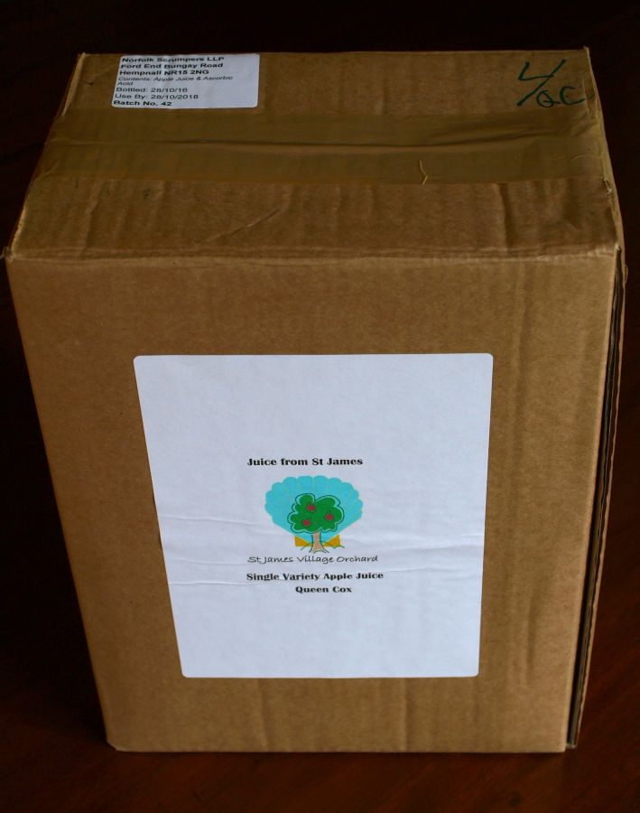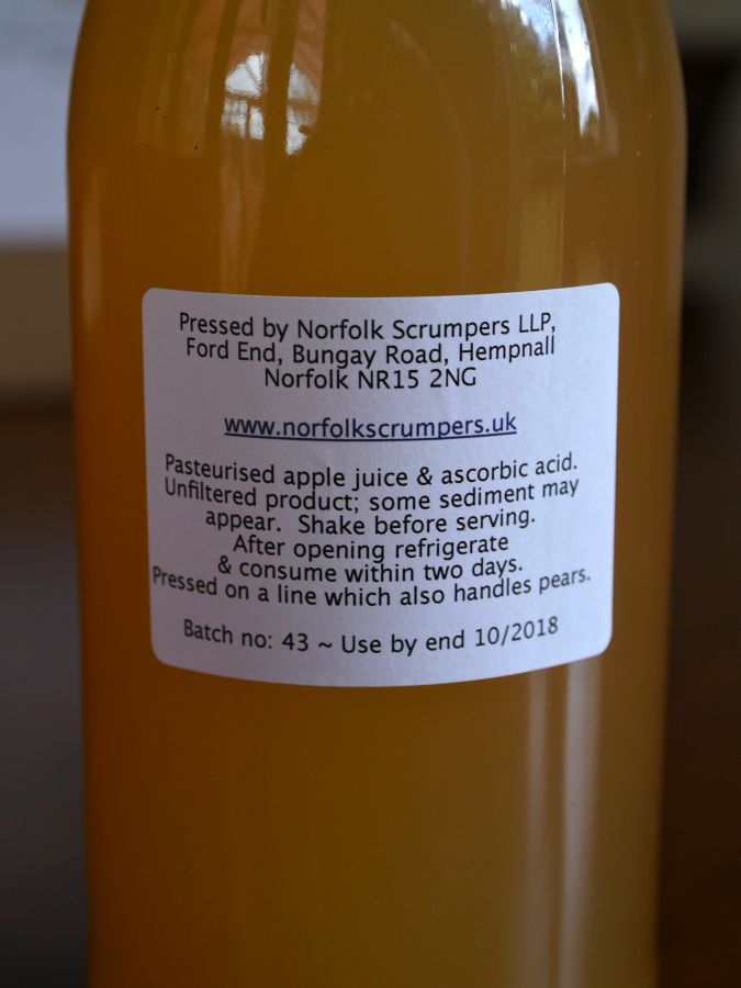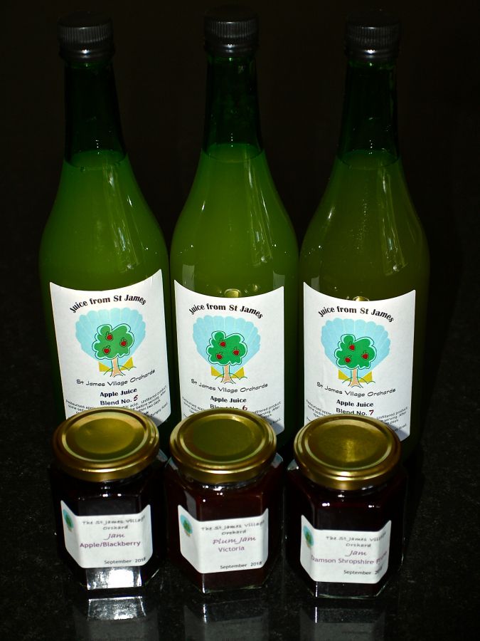 Altogether we produced 113 bottles of juice: 5 to sample and then 9 boxes each of single variety and a blend. These will be used to raise funds to support the upkeep of the orchardSingle variety juice - We decided to try juicing one particular variety that we had a good crop from - Queen CoxQueen Cox Juice - This came out fairly pale in colour but with a distinct Cox flavour and sharpness that is well-suited to lovers of this variety of appleThe St James Blend - Our other batch this year was made from several different varieties and had a richer colour and sweeter flavourThe legal stuff - As well as the credit to and details of Norfolk Scrumpers, our back label had to contain particulars of the juicing process, batch numbers and storage instructionsJuice & Jam 2018 - As the trees mature the fruit crop increases. In 2018 we had enough apples to produce 6 different blends as the season progressed, and over 600 bottles in total. All sale proceeds go to the orchard's upkeep. It was also a good jam year.