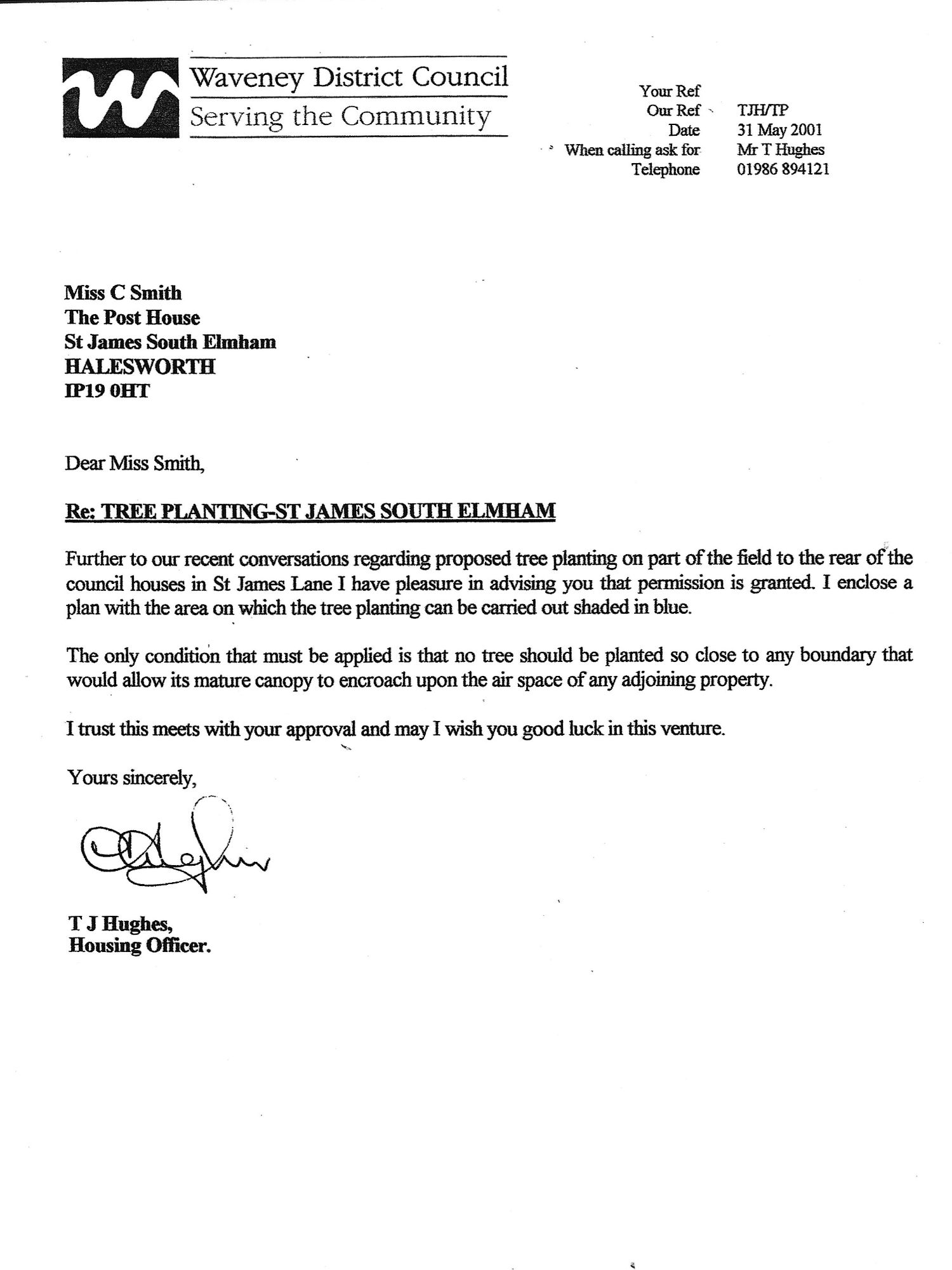 In 2001 an area of rough land adjoining the playing field south of the Village Hall and allotments was being used at the time for bonfires and as a dumping area for rubbish. It was identified by the parish tree warden and others as an ideal location for the creation of a small community woodland. The land in question was owned by Waveney District Council who were very happy to give permission for a portion of it to be used in this way.